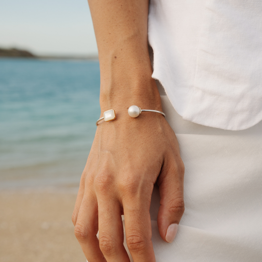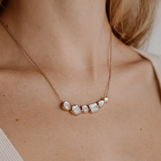 Unlike traditional pearl jewellery, the Radiance Collection pairs our Australian South Sea and Akoya pearls with faceted Mother of Pearl, inspired by the 1920's art deco era of jewellery. This unique combination creates a gemstone effect, making each piece shimmer with light and depth while still carrying the natural beauty of pearls grown at our very own pearl farms.