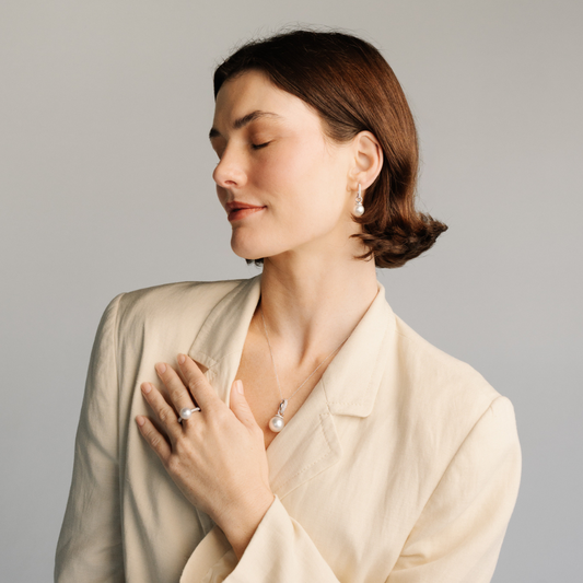 The Stella collection works beautifully with formal evening wear, and looks stunning on black, navy or deep tones. A Stella pendant or ring can even elevate a crisp white t-shirt or little black dress. We recommend pairing a Stella pendant with a finer chain or opt for adding to a timeless pearl strand necklace for a layered look. For the complete look, why not match the pendant with both the Stella ring and Stella huggies?
