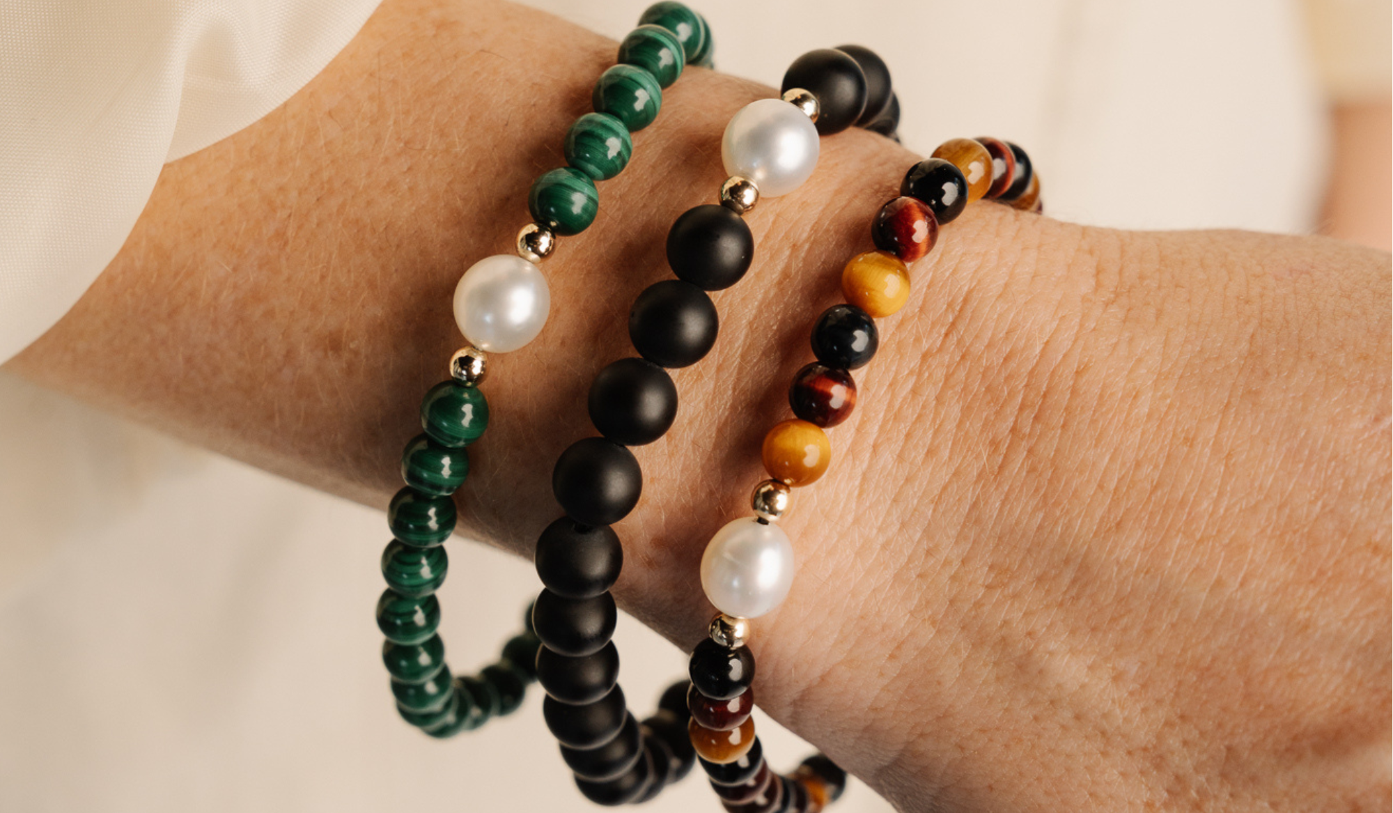 We select natural gems, including malachite, onyx, tiger's eye, rhodonite, and more. These add vibrancy and individuality to our pieces.