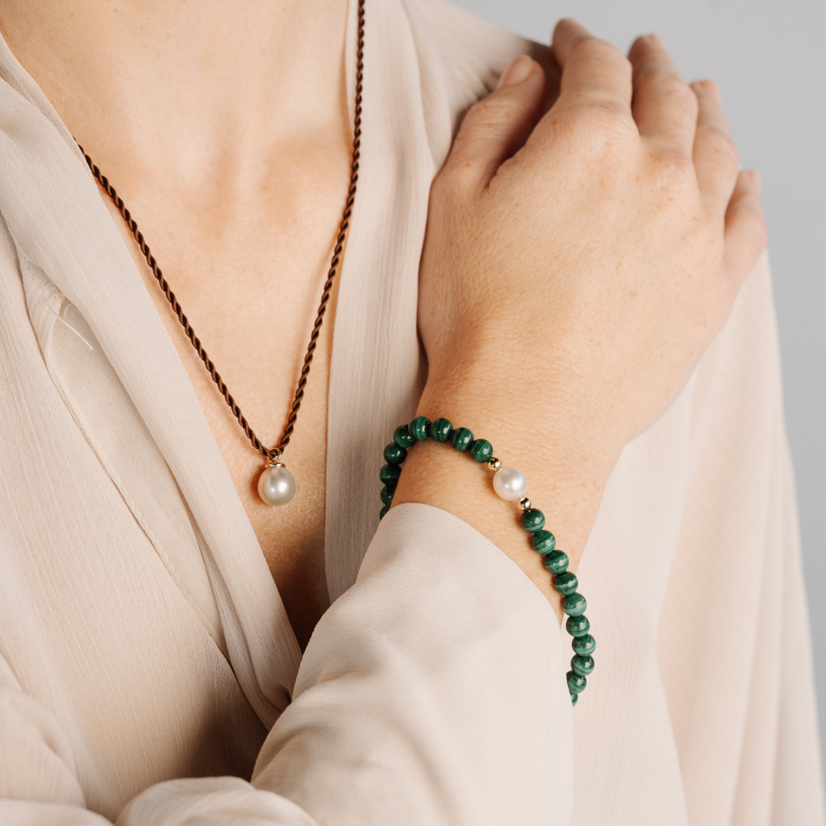 Shae wears a Malachite Pearl bracelet.