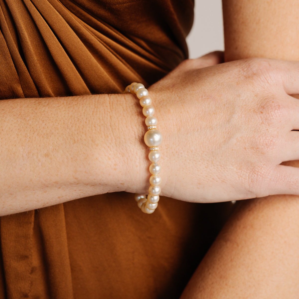 Georgia wears an Akoya and South Sea Pearl Strand Bracelet.