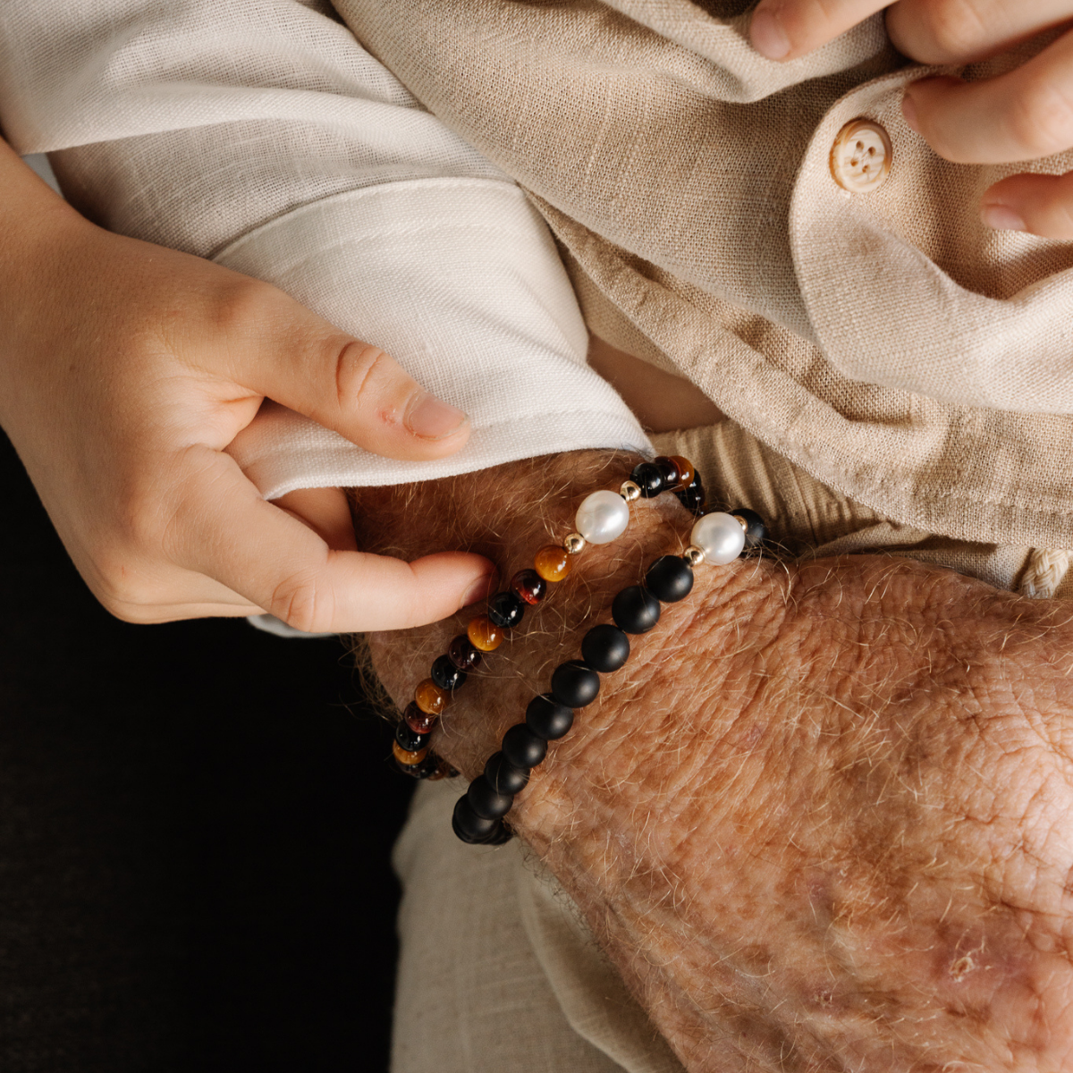 James wears an Onyx Pearl Bracelet and Tiger's Eye Pearl Bracelet stacked.