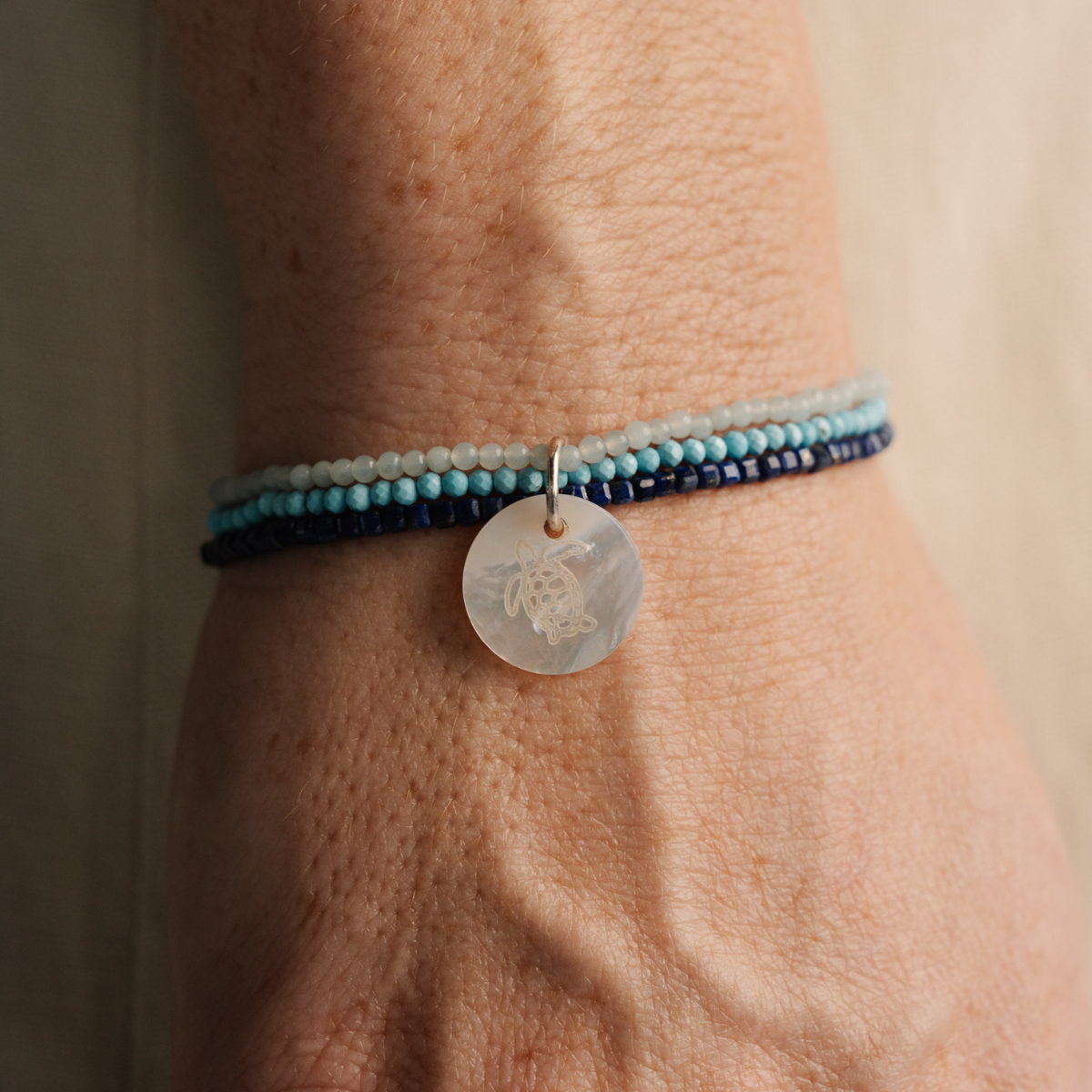 Our Turquoise and Mother of Pearl Charm Bracelet part of the Take 3 for the Sea range.