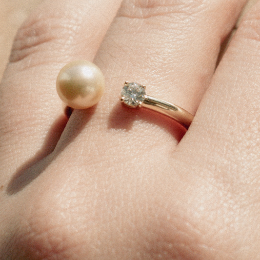 出处钻石 Rondel 开口戒指澳大利亚南海小天鹅湾圆形 10 毫米 A3 和澳大利亚 Akoya 断海湾 7 毫米 AAA 直径 14=0.14 克拉 G/s 尺寸 O 9 克拉黄金