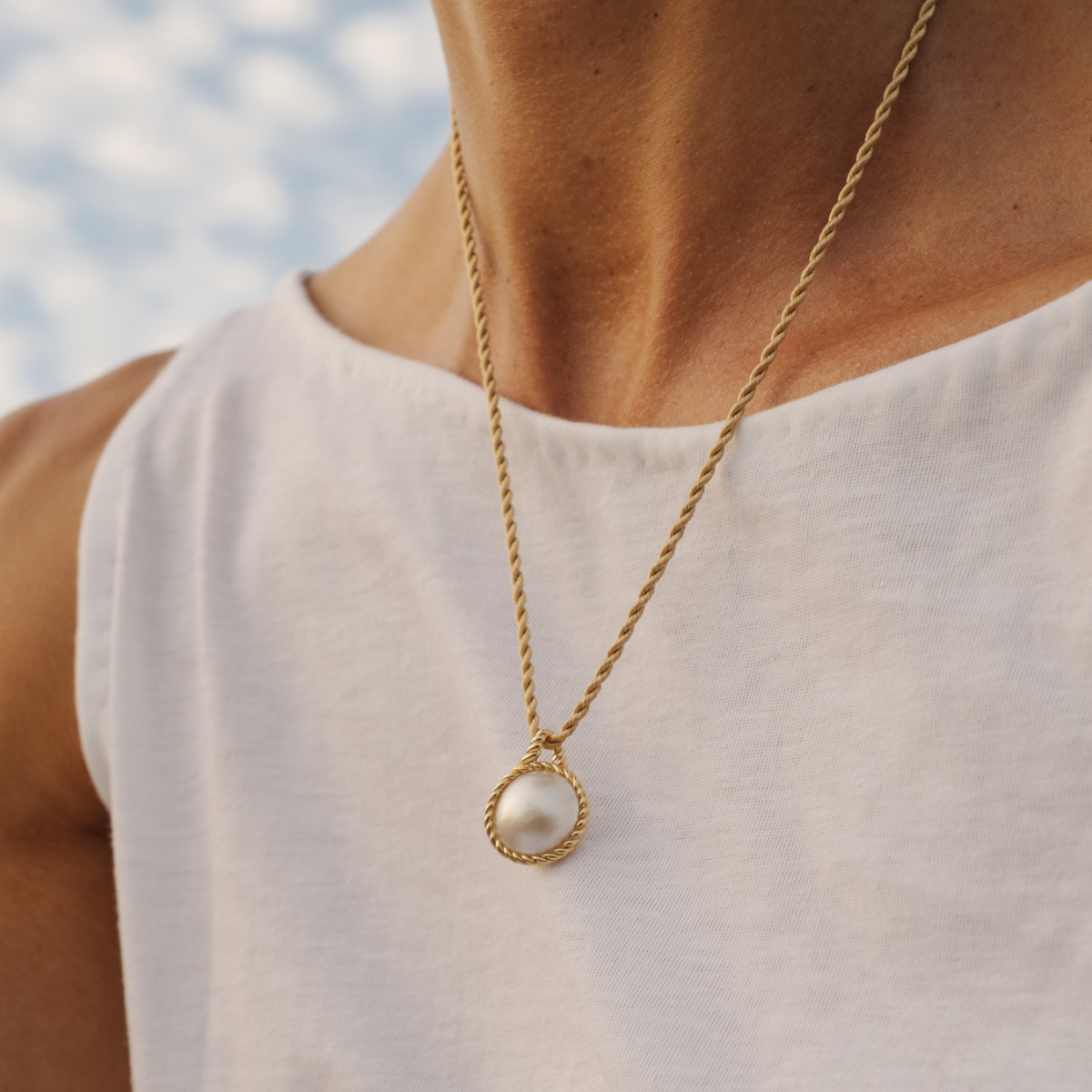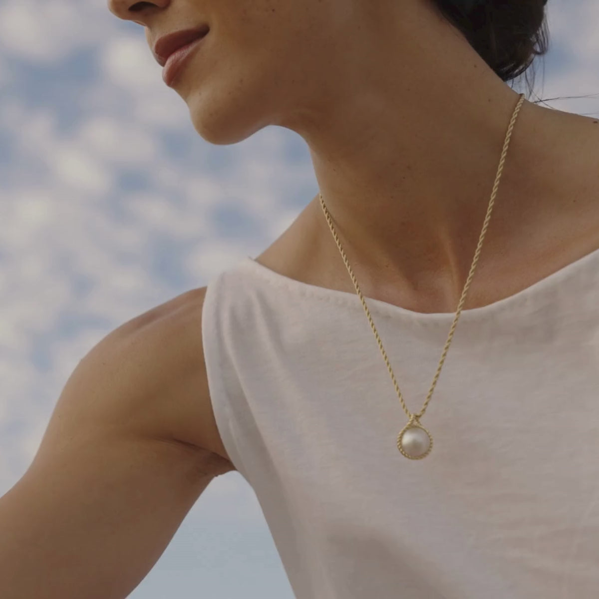A classic Rope Mabe Pearl Pendant featuring our Cygnet Bay (WA) grown 15mm Australian South Sea half (Mabe) pearl set in 9ct gold and sterling silver.